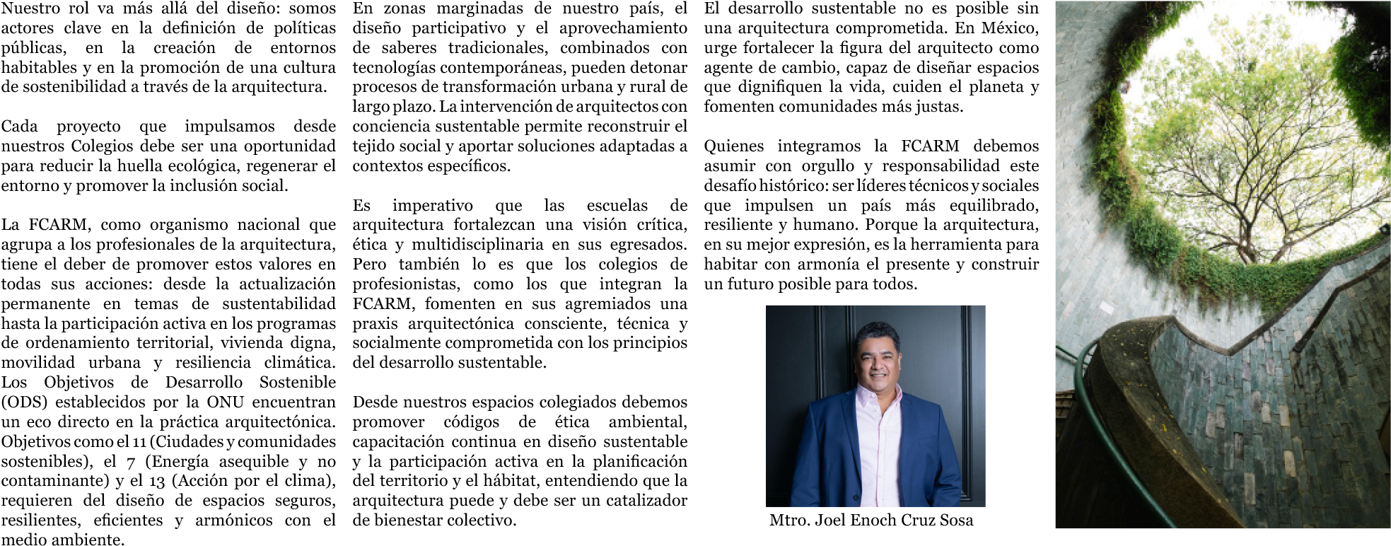 Es imperativo que las escuelas de arquitectura fortalezcan una visión crítica, ética y multidisciplinaria en sus egresados. Pero también lo es que los colegios de profesionistas, como los que integran la FCARM, fomenten en sus agremiados una praxis arquitectónica consciente, técnica y socialmente comprometida con los principios del desarrollo sustentable.
