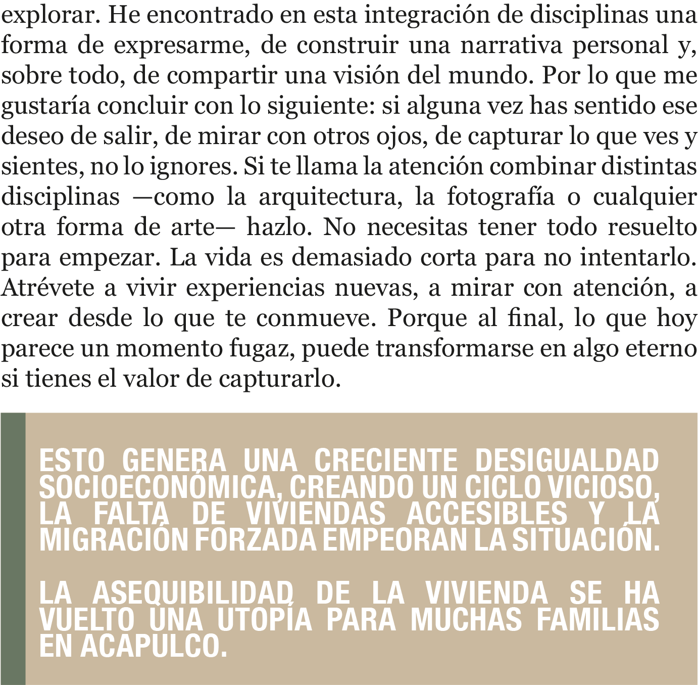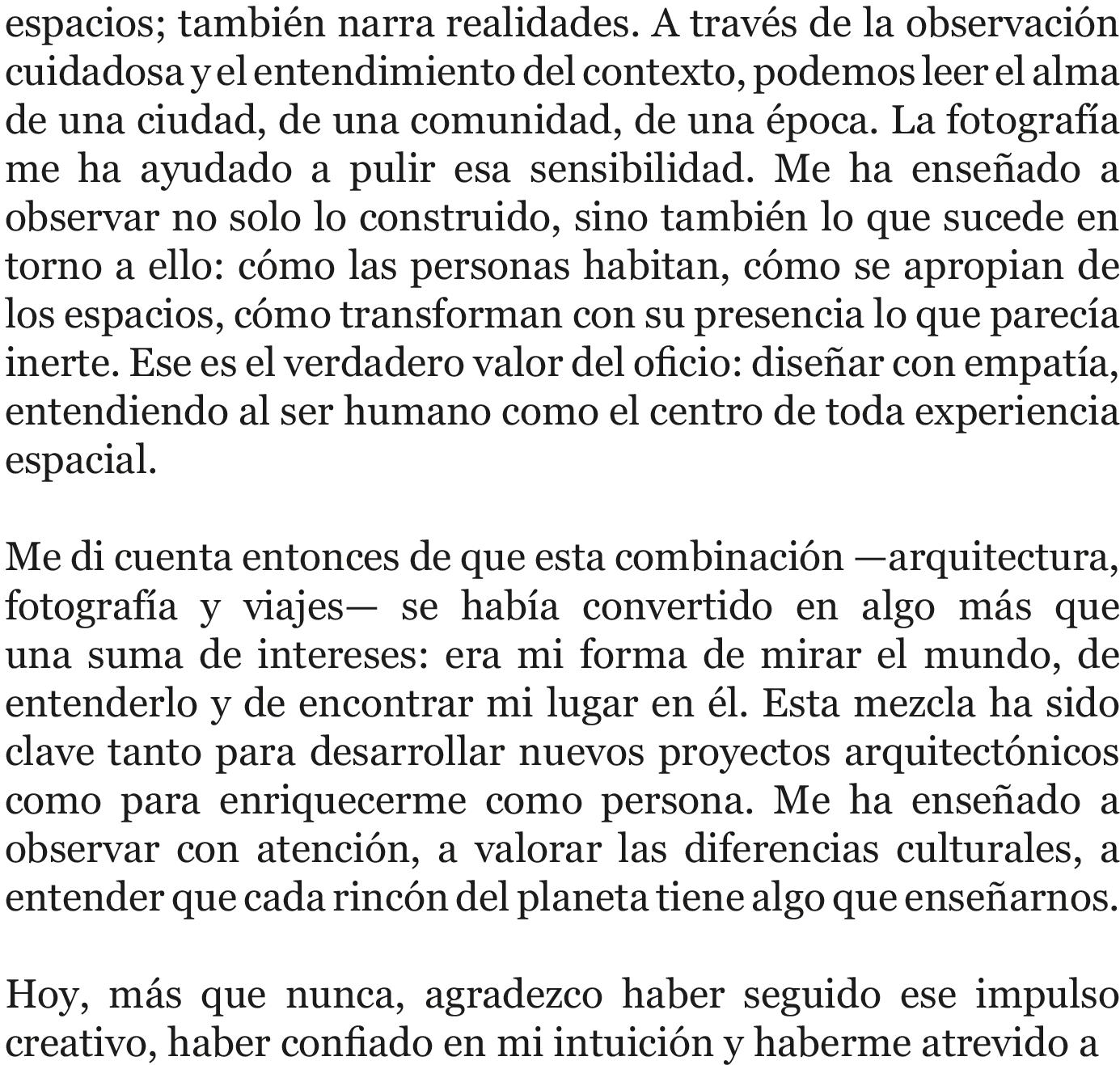 Hoy, más que nunca, agradezco haber seguido ese impulso creativo, haber confiado en mi intuición y haberme atrevido a explorar. He encontrado en esta integración de disciplinas una forma de expresarme, de construir una narrativa personal y, sobre todo, de compartir una visión del mundo. Por lo que me gustaría concluir con lo siguiente: si alguna vez has sentido ese deseo de salir, de mirar con otros ojos, de capturar lo que ves y sientes, no lo ignores. Si te llama la atención combinar distintas disciplinas —como la arquitectura, la fotografía o cualquier otra forma de arte— hazlo. No necesitas tener todo resuelto para empezar. La vida es demasiado corta para no intentarlo. Atrévete a vivir experiencias nuevas, a mirar con atención, a crear desde lo que te conmueve. Porque al final, lo que hoy parece un momento fugaz, puede transformarse en algo eterno si tienes el valor de capturarlo.