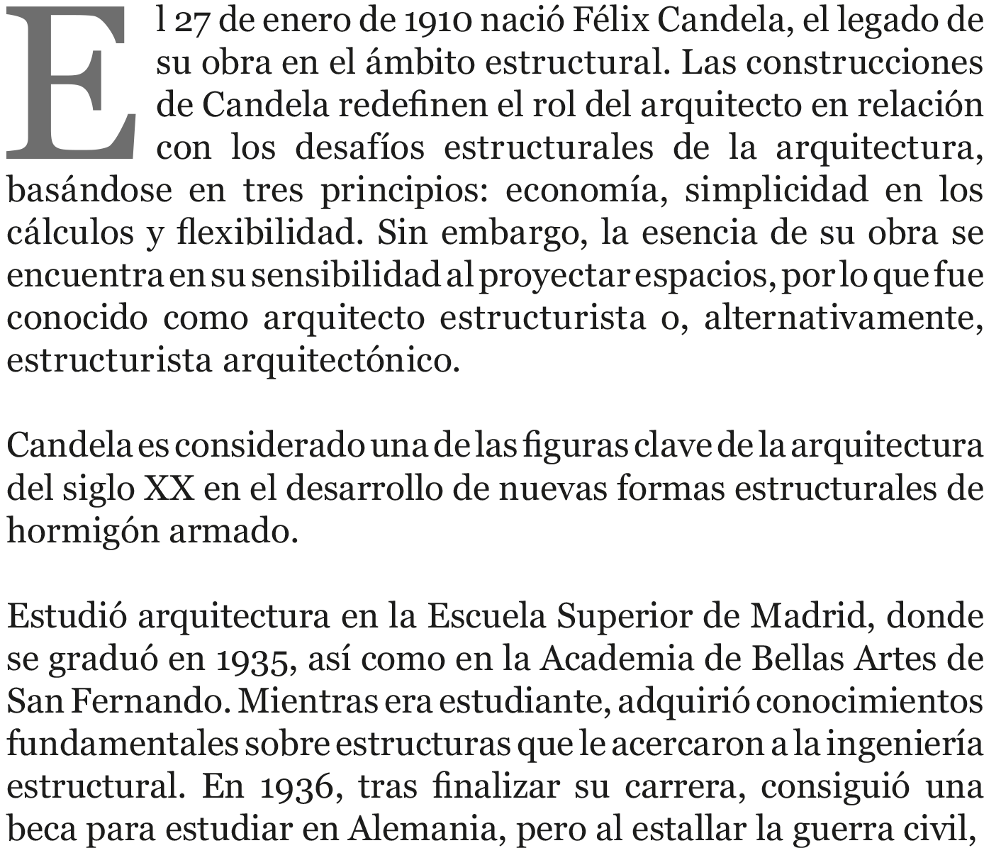 El 27 de enero de 1910 nació Félix Candela, el legado de su obra en el ámbito estructural. Las construcciones de Candela redefinen el rol del arquitecto en relación con los desafíos estructurales de la arquitectura, basándose en tres principios: economía, simplicidad en los cálculos y flexibilidad. Sin embargo, la esencia de su obra se encuentra en su sensibilidad al proyectar espacios, por lo que fue conocido como arquitecto estructurista o, alternativamente, estructurista arquitectónico.