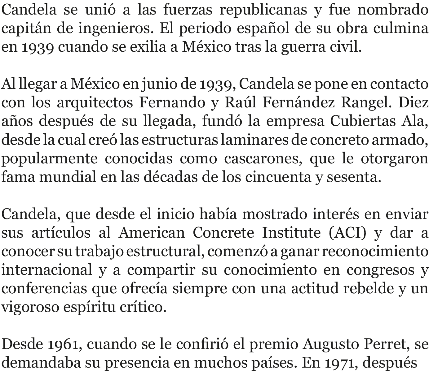 Al llegar a México en junio de 1939, Candela se pone en contacto con los arquitectos Fernando y Raúl Fernández Rangel. Diez años después de su llegada, fundó la empresa Cubiertas Ala, desde la cual creó las estructuras laminares de concreto armado, popularmente conocidas como cascarones, que le otorgaron fama mundial en las décadas de los cincuenta y sesenta.