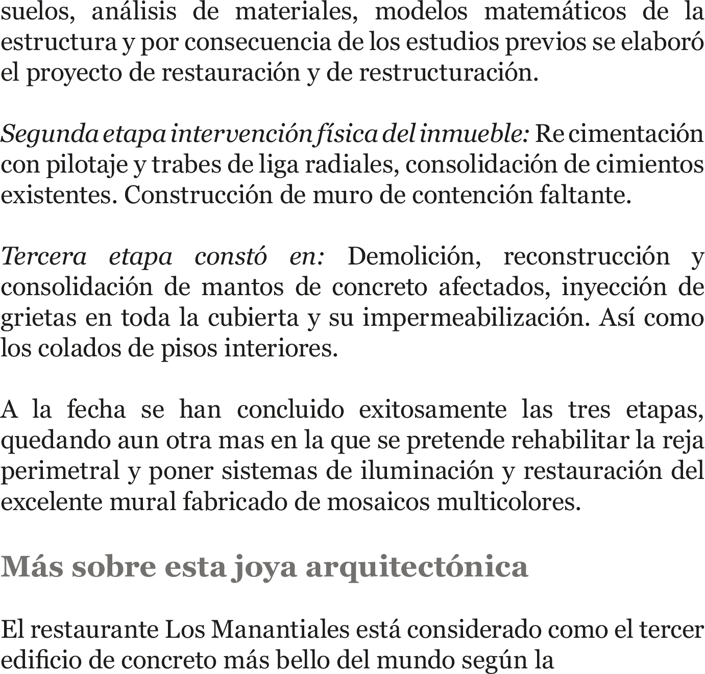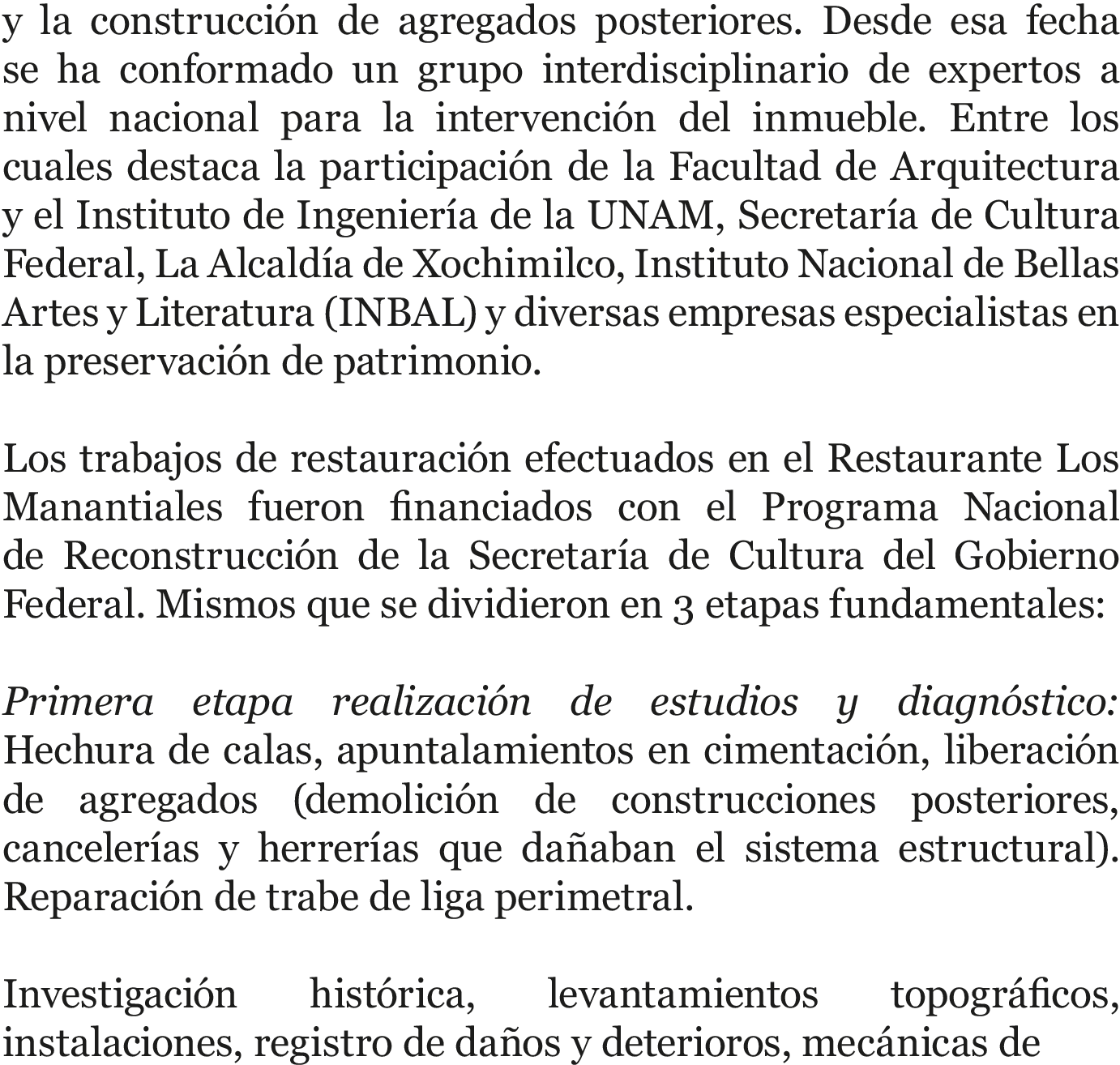 Los trabajos de restauración efectuados en el Restaurante Los Manantiales fueron financiados con el Programa Nacional de Reconstrucción de la Secretaría de Cultura del Gobierno Federal. Mismos que se dividieron en 3 etapas fundamentales: