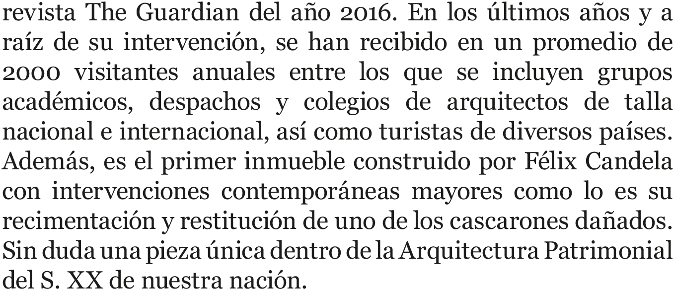 El restaurante Los Manantiales está considerado como el tercer edificio de concreto más bello del mundo según la revista The Guardian del año 2016. En los últimos años y a raíz de su intervención, se han recibido en un promedio de 2000 visitantes anuales entre los que se incluyen grupos académicos, despachos y colegios de arquitectos de talla nacional e internacional, así como turistas de diversos países. Además, es el primer inmueble construido por Félix Candela con intervenciones contemporáneas mayores como lo es su recimentación y restitución de uno de los cascarones dañados. Sin duda una pieza única dentro de la Arquitectura Patrimonial del S. XX de nuestra nación.