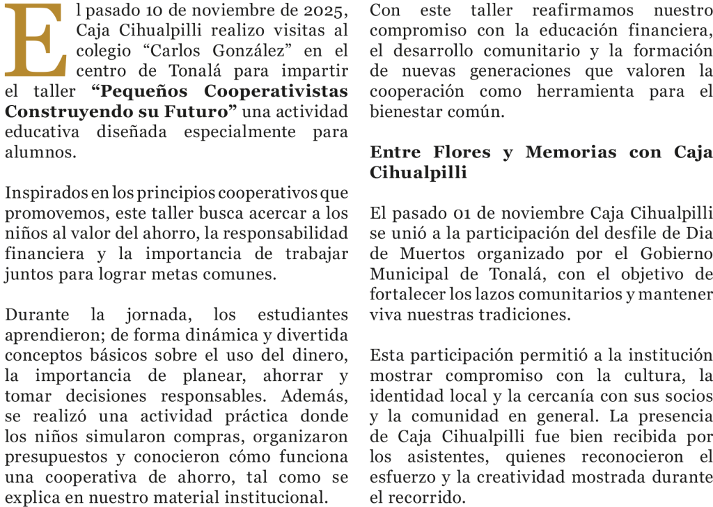 El pasado 10 de noviembre de 2025, Caja Cihualpilli realizo visitas al colegio “Carlos González” en el centro de Tonalá para impartir el taller “Pequeños Cooperativistas Construyendo su Futuro” una actividad educativa diseñada especialmente para alumnos.