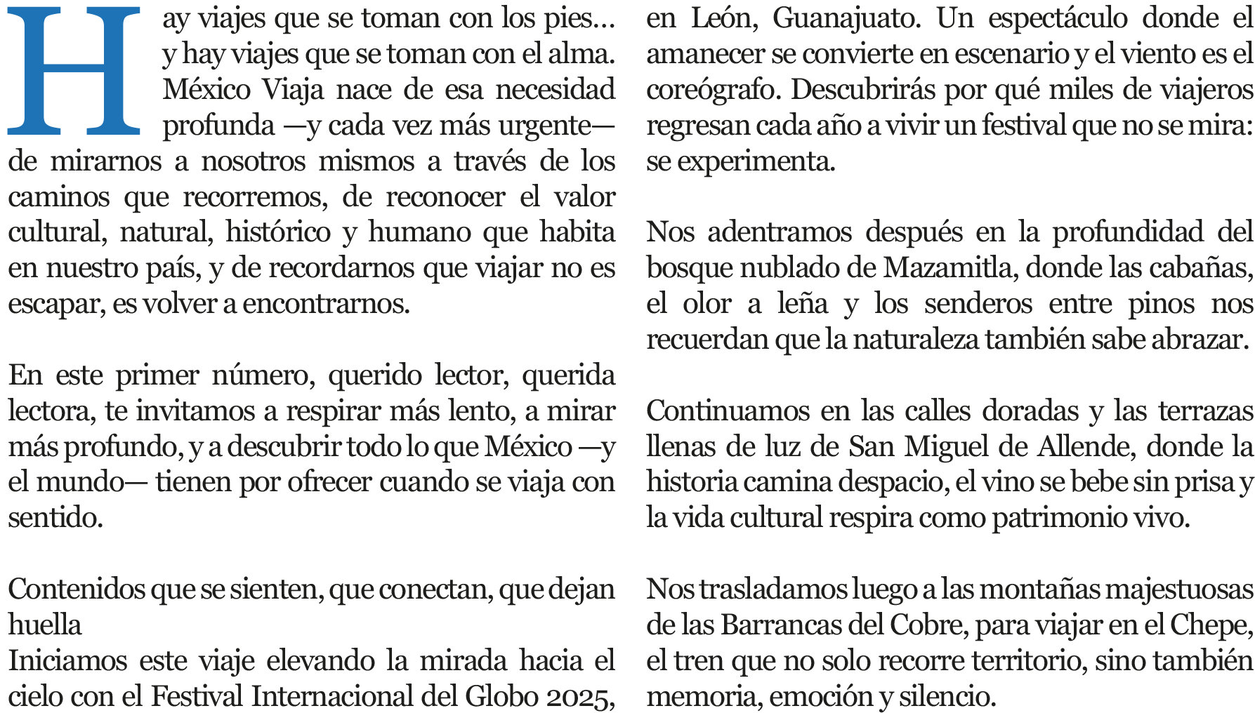 En este primer número, querido lector, querida lectora, te invitamos a respirar más lento, a mirar más profundo, y a descubrir todo lo que México —y el mundo— tienen por ofrecer cuando se viaja con sentido.