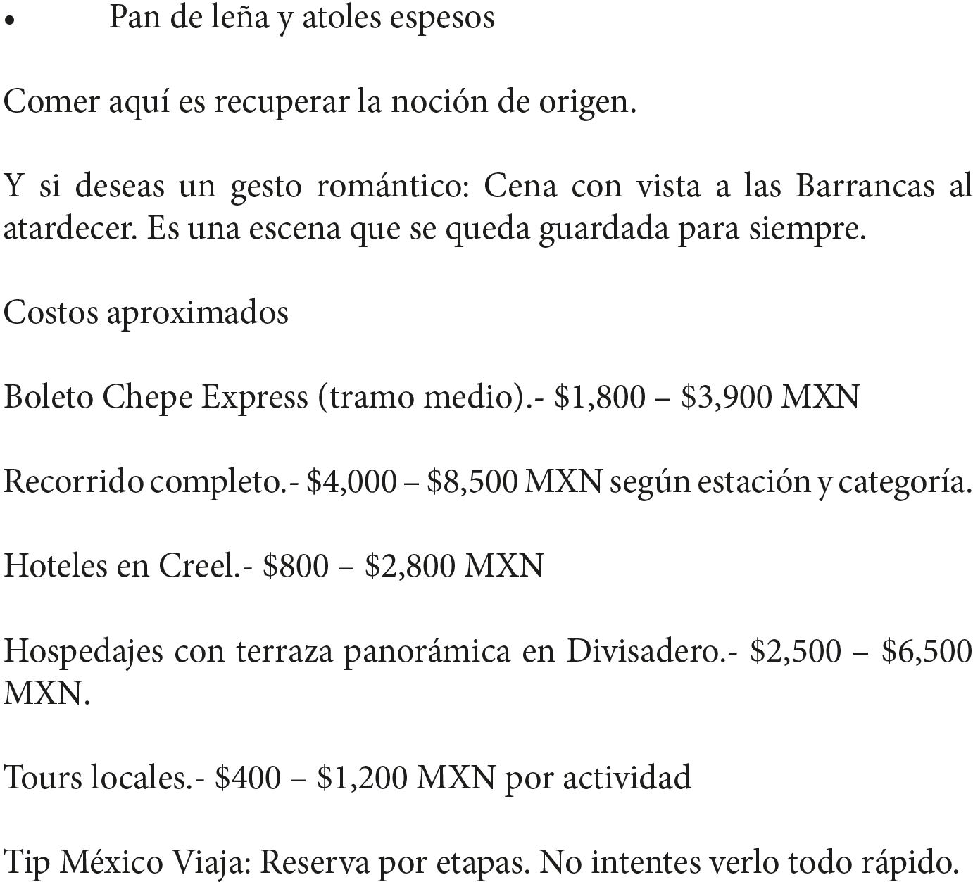 Boleto Chepe Express (tramo medio).- $1,800 – $3,900 MXN