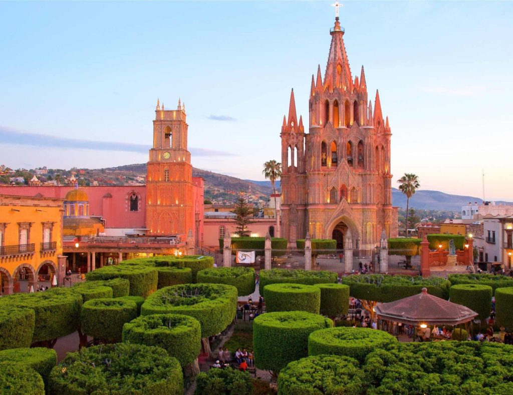 En el centro histórico de adoquines de la ciudad, se encuentra la Parroquia de San Miguel Arcángel, de estilo neogótico, cuyas espectaculares torres rosas se alzan por sobre la plaza principal, El Jardín.