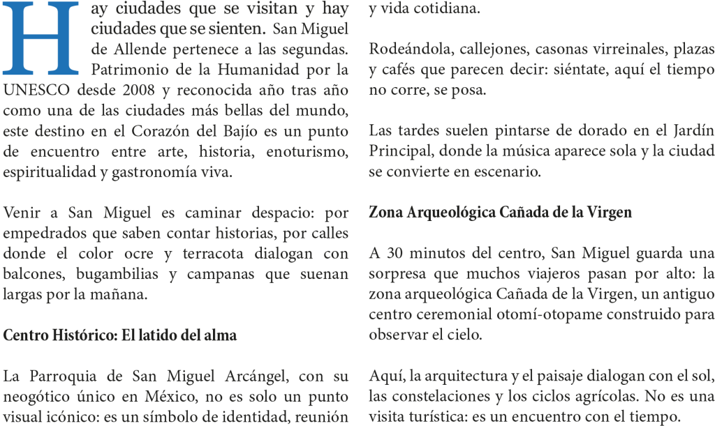 Hay ciudades que se visitan y hay ciudades que se sienten. San Miguel de Allende pertenece a las segundas. Patrimonio de la Humanidad por la UNESCO desde 2008 y reconocida año tras año como una de las ciudades más bellas del mundo, este destino en el Corazón del Bajío es un punto de encuentro entre arte, historia, enoturismo, espiritualidad y gastronomía viva.