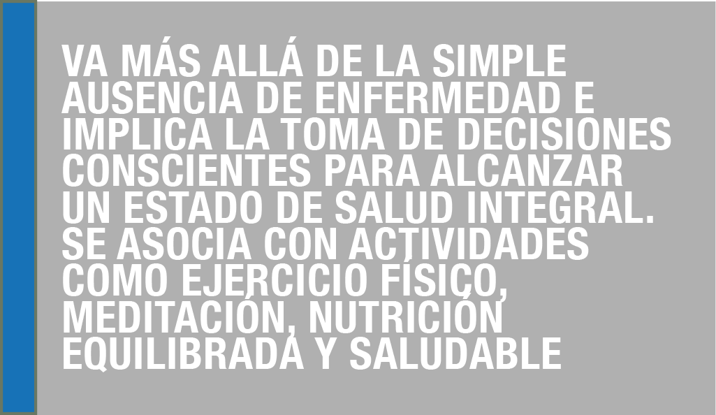 Va más allá de la simple ausencia de enfermedad e implica la toma de decisiones conscientes para alcanzar un estado de salud integral. Se asocia con actividades como ejercicio físico, meditación, nutrición equilibrada y hábitos saludables.