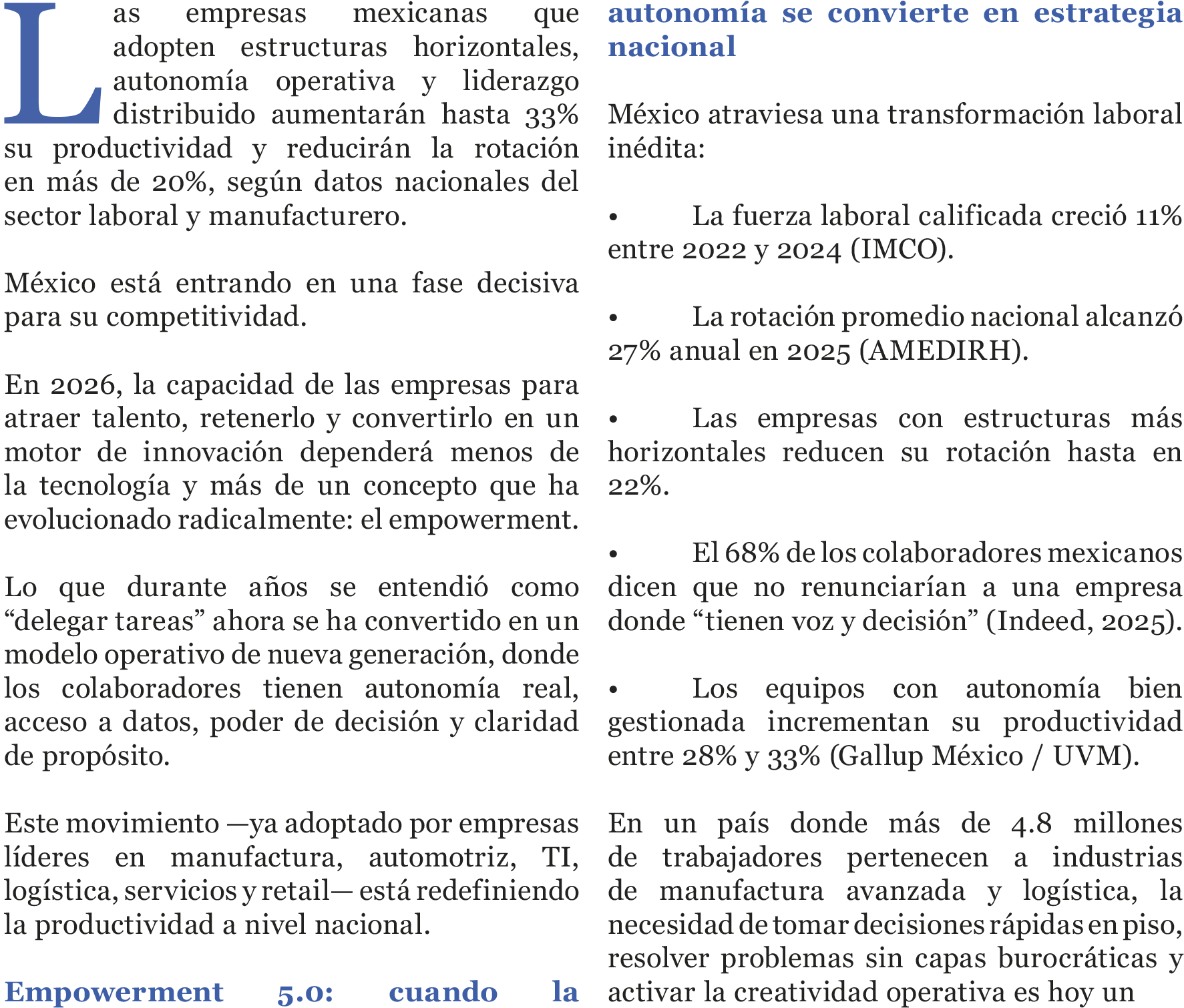 Las empresas mexicanas que adopten estructuras horizontales, autonomía operativa y liderazgo distribuido aumentarán hasta 33% su productividad y reducirán la rotación en más de 20%, según datos nacionales del sector laboral y manufacturero.